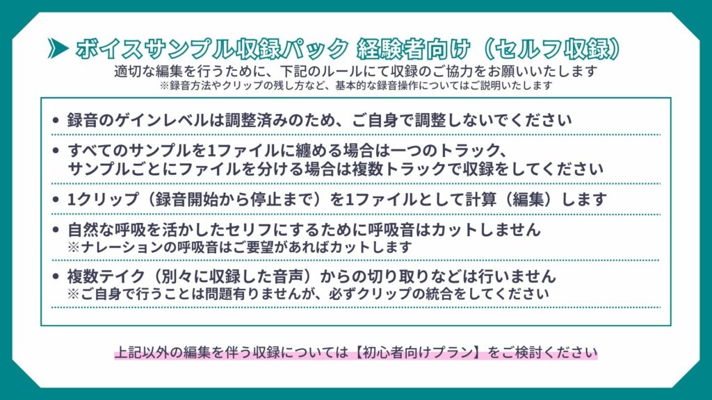 上記以外の編集を伴う収録については【初心者向けプラン】をご検討ください。